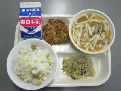 今日の献立は、減量さつまいもご飯・てんぷらうどん・じゃこサラダ・牛乳です。ごちそうさまでした。
