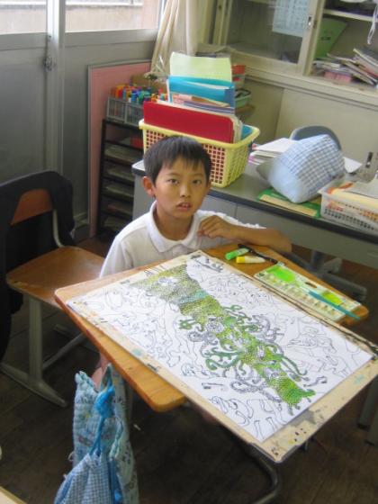 「不思議な木」の下絵を終え、いよいよ色塗りです。