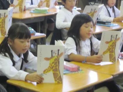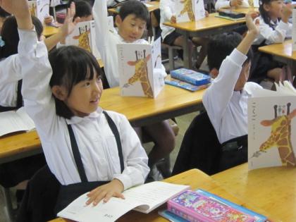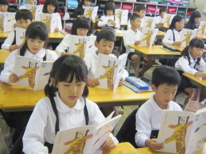 写真上:じゃ、もう一度みんなで読んでみようか。