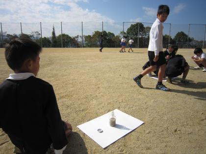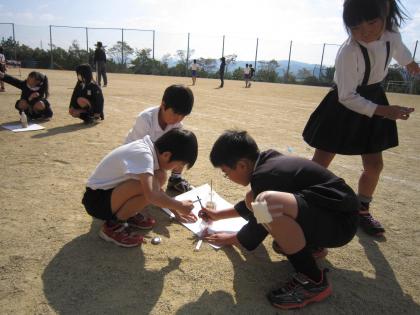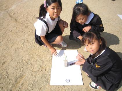 運動場で、かげの動き方を10時・12時・14時の3回調べました。太陽と比べて、どちらに見えたか、長さはどう変わったかが観察のポイントです。