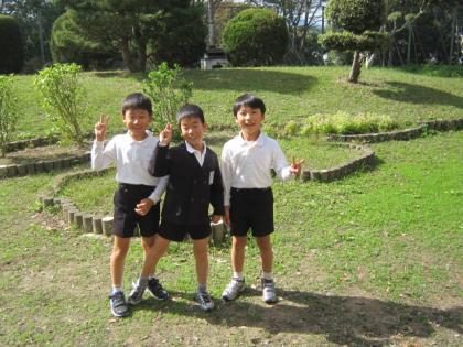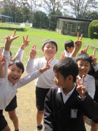 写真上:鬼ごっこの途中にピース!