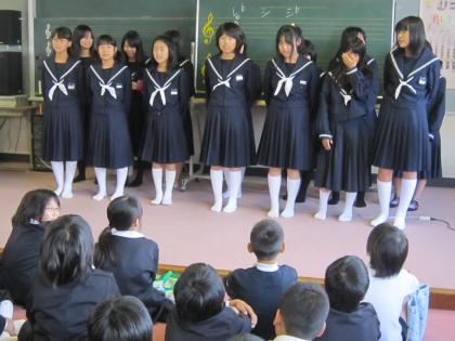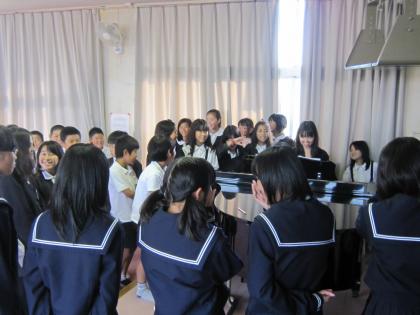その練習の助っ人として、本校出身の谷川 紅音さん(2年)と伏尾久美子さん(2年)が所属する紀見東中学校の音楽部(コーラス)顧問津守先生とメンバー14名に来て頂きました。お手本を見せてもらうとともに、ワンポイントレッスン(最初に出す言葉を強くはっきり。次につなぐ言葉は切らずにのばすように声を出す等)をして頂きました。