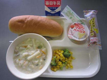 今日の献立は、パン・マカロニのクリーム煮・ブロッコリーとコーンのサラダ(ドレッシングは和風ごまドレッシング)・牛乳です。