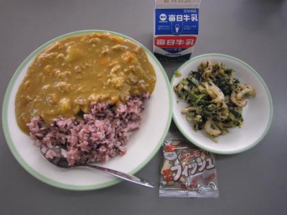 今日は「げんきっ子こんだて」です。柿とひね鶏のカレーライス・いそか和え・アーモンドフィッシュ・牛乳でした。黒米にカレー、色どりが斬新でした(>_<)
