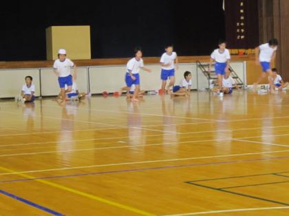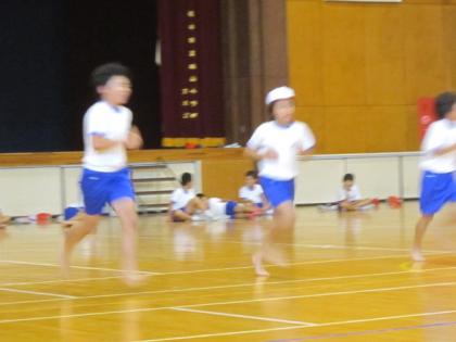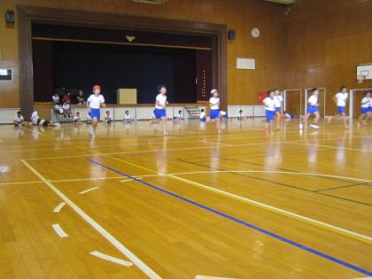 体育館で6年生がスポーツテストのシャトルラン(音楽に合わせ20メートルの直線間を往復する)をしていました。