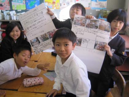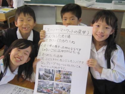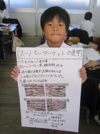 スーパーマーケットの見学に行ってきたことを、グループごとに画用紙2〜3枚にまとめていました。写真あり、イラストありと、うまくできていました。