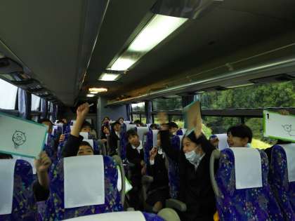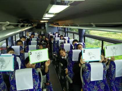 6年 修学旅行 3 公開日 2016/10/13 更新日 2016/10/13 6年生 10月13日(木) 早朝から元気です。レクリエーション係によるバスレクが始まりました。写真はB組の「列対抗 一筆描きゲーム」です。画伯揃いで、大笑いしています。 いいね(0)