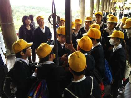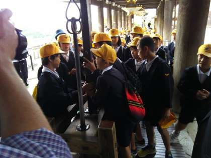清水寺に入って行くと、鉄の錫杖(しゃくじょう)と高下駄があります。90キラグラム以上もある大錫杖を持ち上げようと、友達と力を合わせます。さて、持ち上げられますでしょうか。