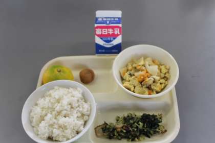 今日の給食の献立は、木の葉丼・磯香和え・みかん・梅干し・牛乳です。