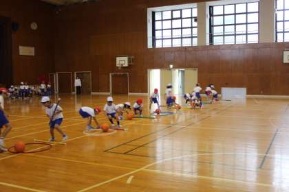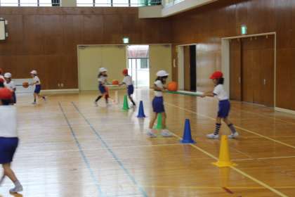 また、ボールをついたり、棒2本にボールをはさんで運んだりなど、子ども達はにこにこしながら、運動しました。とっても、上手に運んでいました。