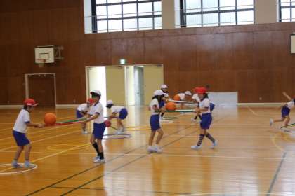 その後、大きなコートで、A組対B組で、ドッジボールをしました。2つのボールを使って、楽しくできました。