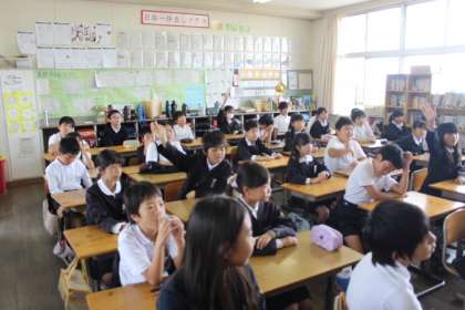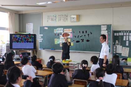 4B 外国語活動 公開日 2016/10/17 更新日 2016/10/17 4年生 10月17日(月)英語 曜日・天気や気分を聞いたあと、「はらぺこあおむし」の動画を見ました。英語でしゃべっています。なかなか速くて聞き取れない言葉もあったのですが、それを耳で聞きました。日本語では、わかっているので、英語でも様子がなんとなくわかりました。その後、お話に出てくる食べ物やその色を確認しました。最後に、影絵から何か当てるクイズをしました。 いいね(0)