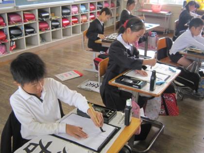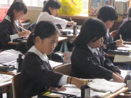 4年生の教室では、習字の授業をしていました。『左右』の字を書いていました。先生が「手本を見て、二つの字の違いは?」と気づいたことについて質問をしました。筆順の違い、横棒の長さの違い、中央線があるとしてエと口の部分の位置の違い、はらいの長さや角度の違いなどを子ども達が色々なところに気付いてから、手本を示していました。