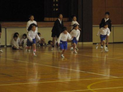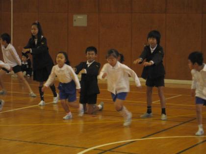体育館では、昨日のクラスに続き、1年生のもう一つのクラスの児童が6年生の子ども達の助けを借りて、スポーツテスト(シャトルラン)をしていました。