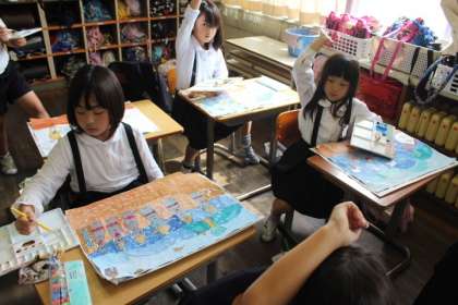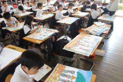 おじぞうさまにかさをかぶせている場面を描いている子、お礼の品物を届けている場面を描いている子など、かきたい場面をかきました。