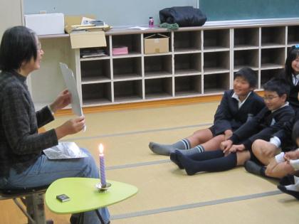 今日は3年生のおはなし会です。最初のお話は、少し怖くてみんなドキドキしながら聞きました。しかけ絵本では、絵の中の“穴”が次々といろんなものに変身していくので、耳も目も離せませんでした。