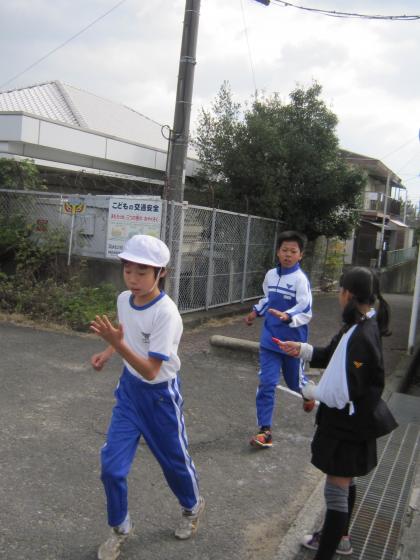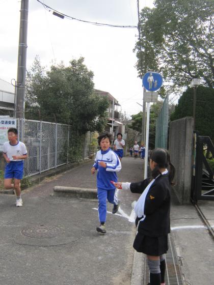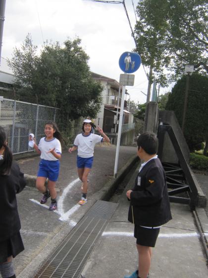 5・6年生がマラソンコースを走るとき、1周走り終わると手にチェックをしてもらいます。