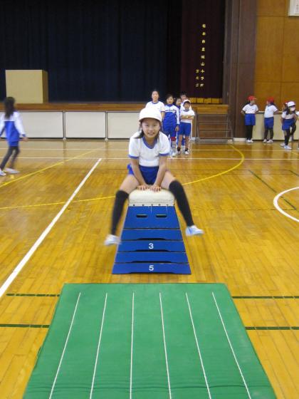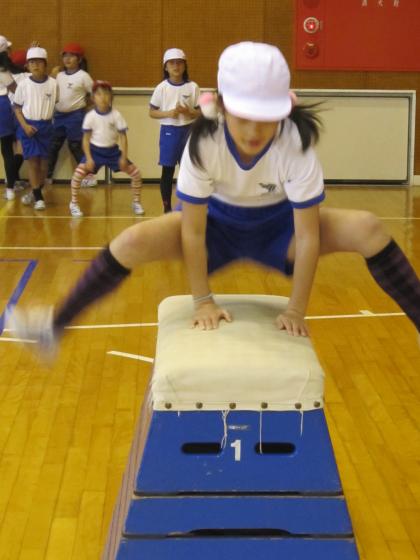 写真上:跳び箱に挑戦。5段は手ごわいなぁ。