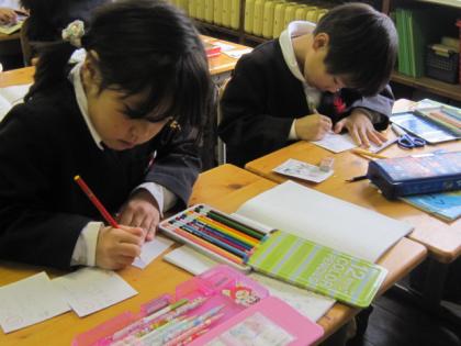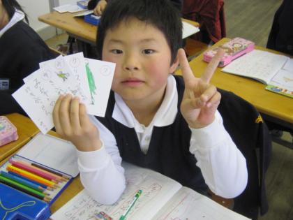 「冬のことばあつめ」を勉強しました。それらの言葉に関連する文を考えて、カルタ作りをしています。