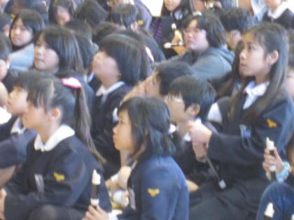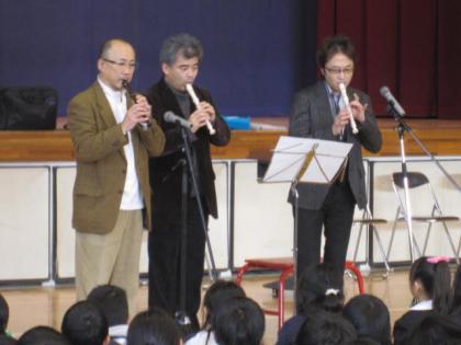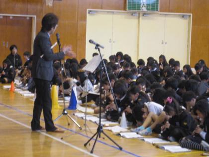 大橋先生のピアノ伴奏に松沼先生が曲想を説明してくださり、子ども達はイメージを広げていました。3部や2部に分かれたパートもあり、先生方の演奏にじっと耳を傾けました。
