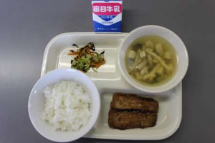 今日の給食の献立は、ごはん、さんまのかば焼き、白菜のさっぱりサラダ、すまし汁、牛乳です。ごちそうさまでした。