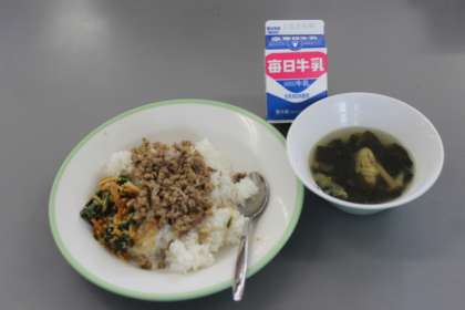 今日の給食の献立は、ビビンバ、わかめスープ、牛乳です。ごちそうさまでした。