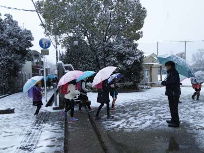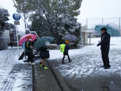 暦の上では、春になりましたが、今季最大級の寒波が日本列島を覆いました。この城山台にも朝から雪が降り積もりました。寒さが非常に厳しい朝でしたが、子どもたちは、笑顔で元気よく登校しました。