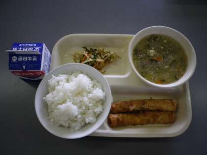 今日の給食の献立は、ごはん、ちくわの照り煮、ごまあえ、けんちん汁、牛乳です。ごちそうさまでした。