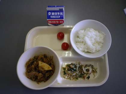 今日の給食の献立は、ごはん、麻婆春雨、ナムル、ミニトマト、牛乳です。ごちそうさまでした。