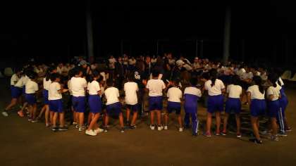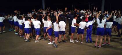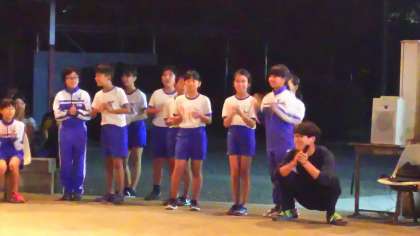 音楽の授業で井上先生が教えてくださっている手拍子リレーです。気持ちを1つにすることで、タイムがどんどん縮まります。