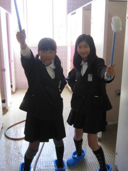 写真上:トイレそうじ、カメラの前ではピンクレディ?違うよ、AKBだよ!