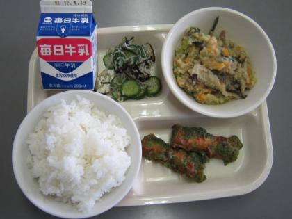 今日の献立は、ご飯・竹輪の磯辺揚げ・キュウリの昆布和え・卯の花の炒り煮・牛乳です。ごちそうさまでした。