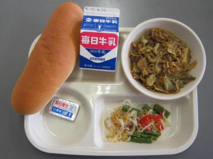 今日の献立は、減量パン・焼きそば・アスパラのサラダ・チーズ・牛乳です。ごちそうさまでした。
