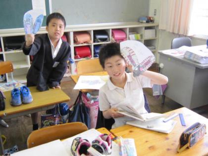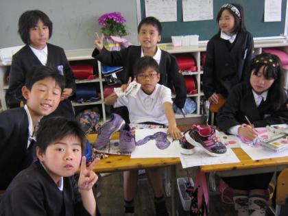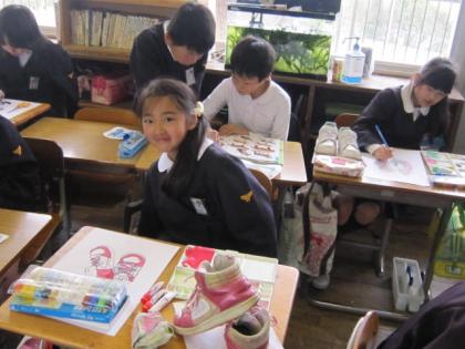 児童玄関でいると、5年生が靴を持ちました。「どうしたの?」「靴の絵を描くの。」早速、教室へおじゃましました。
