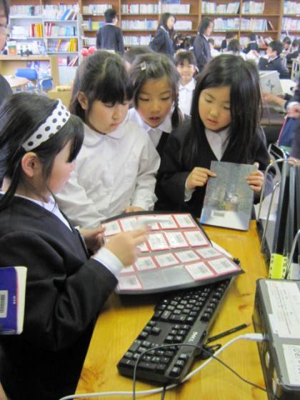 下:バーコードで貸出完了。「不思議、これで借りたのがわかるんだ」との声。