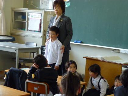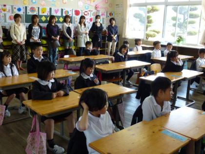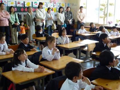 小学校はじめての授業参観です。お母さんたちに見られながらの勉強は、黒板より後ろが気になります。