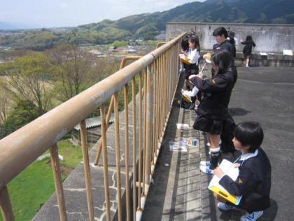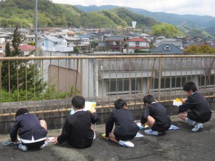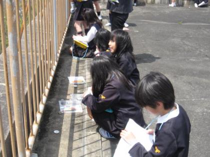 写真上:一生懸命な姿は素晴らしいですね。学校の北側をスケッチしています。