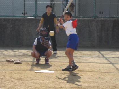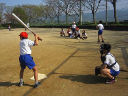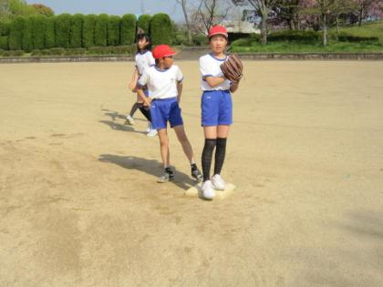ソフトボールクラブです。学校の隣にある中央公園のグランドで行っています。部員は24名です。学年、男女等技術・体力の差はかなりあるなか、できる子がリードして楽しんでいました。