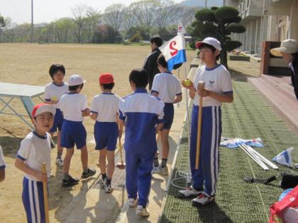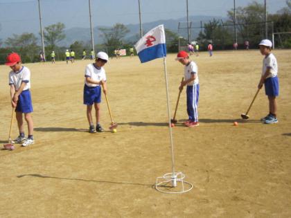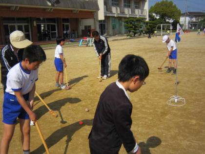グランドゴルフクラブです。部員は12名で、本校のグランドを使い行っています。初日ということで、まずはクラブ(?)の感触を確かめ、打つ強さと転がる距離を確認しあい、ホールを作ってゲームを楽しんでいました。