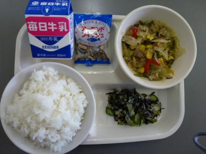 今日の献立は、ご飯・豚肉と春雨のカラフル炒め・ひじきと季節の野菜サラダ・アーモンドフィッシュ・牛乳です。ごちそうさまでした。