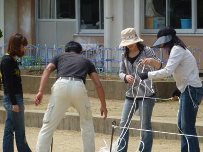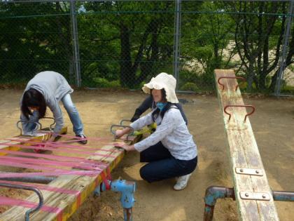 午前中に子ども達が準備してくれた後を引き継いで、1時半からPTAの役員さんと職員とで、準備を行いました。遊具を使用禁止に、杭打ち、ロープ張り、入退場門作り、万国旗張り、ライン引き等を行いました。