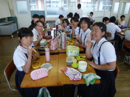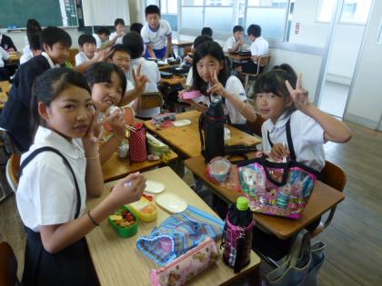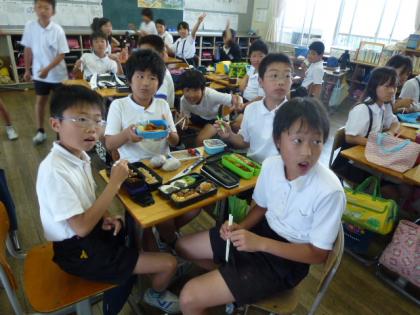 運動会の予備日として、本日(6/5)は給食を止め、お弁当の日にしていました。給食とは一味も二味も違う六年生のお昼時です。