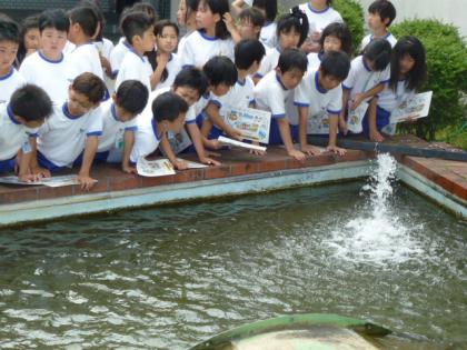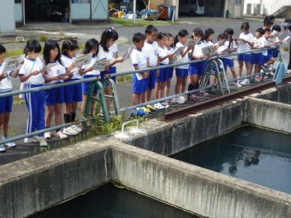☆ 4年「浄水場の見学」② 公開日 2012/06/06 更新日 2012/06/06 4年生 6月6日(水) 浄水場の見学に行ってきました。 写真上:鯉が泳いでいるよ。そうか、水質により鯉に異変がないか確認して いるんだ。 中:あっちが沈澱池と ろ過池なんだ。 下:水と薬を大きな水車でかき混ぜて、ゴミなどを小さな固まりにして いるんだね。 いいね(0)
