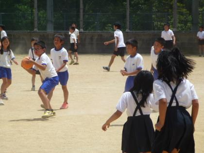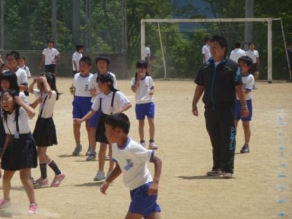 写真上:午前中、浄水場に行ってきた4年の堂本先生。昼休みに外へ出て子どもと一緒にドッジボールをしていました。恐るべし体力。子ども達は大喜びでした。