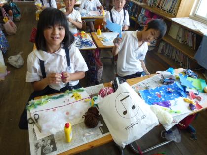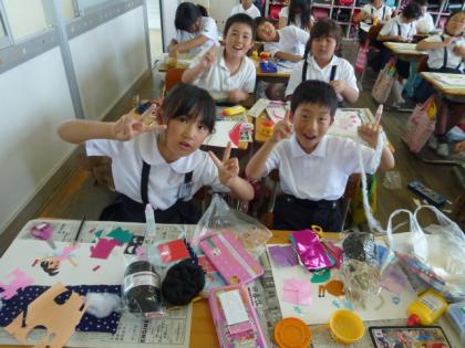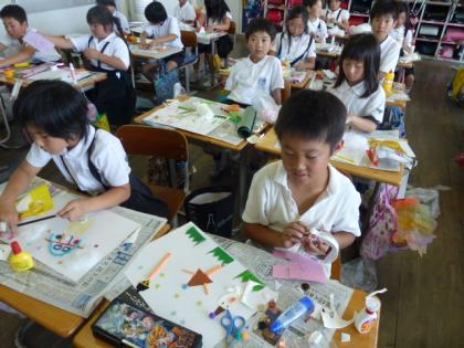 3年の教室を覗くと、好みの色の画用紙の上に色々なもの(色紙、綿、フェルト、毛糸、紙コップ等)を組み合わせて立体的な作品をつくっていました。子どもらしい独自の発想で描いた、かわいい作品をたくさん見ることができました。一部、写真を通して紹介します。