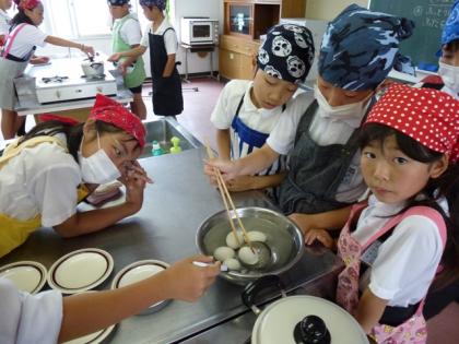 「ゆでる」という調理法を学び、それをゆで卵で実践します。