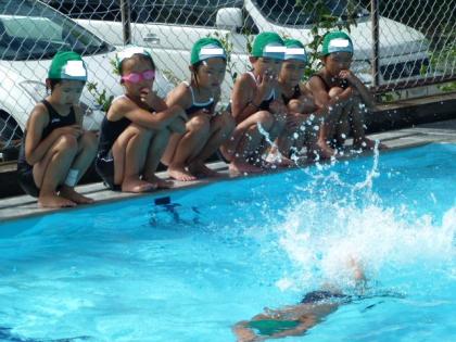 1年生は、①泳力測定、②宝さがし、③紅白玉入れ ④自由水泳 を行いました。