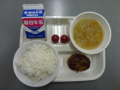 ごはん、ハンバーグきのこソース、ミニトマト、コンソメスープ、牛乳