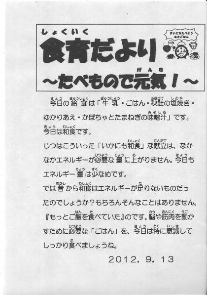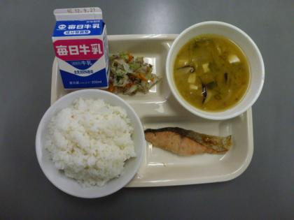 ごはん、あきざけのしおやき、ゆかりあえ、かぼちゃとたまねぎのみそしる、牛乳
