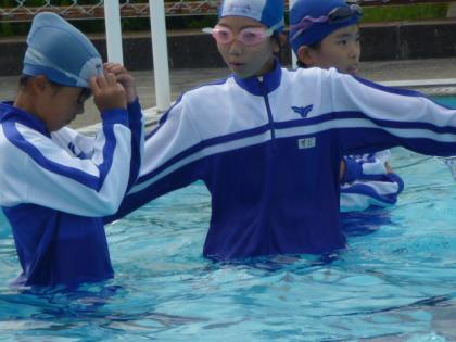後半は水着の上に体操服を着て「着衣水泳」体験をしました。いつもなら、プールの横(15,6メートル)など、すぐに泳げるはずなのに、泳ぎ切れた子は1/3しかいませんでした。「重い」、「動かない」、「進まない」と言う声に代表されるように、思うように泳ぐことができない体験をしました。